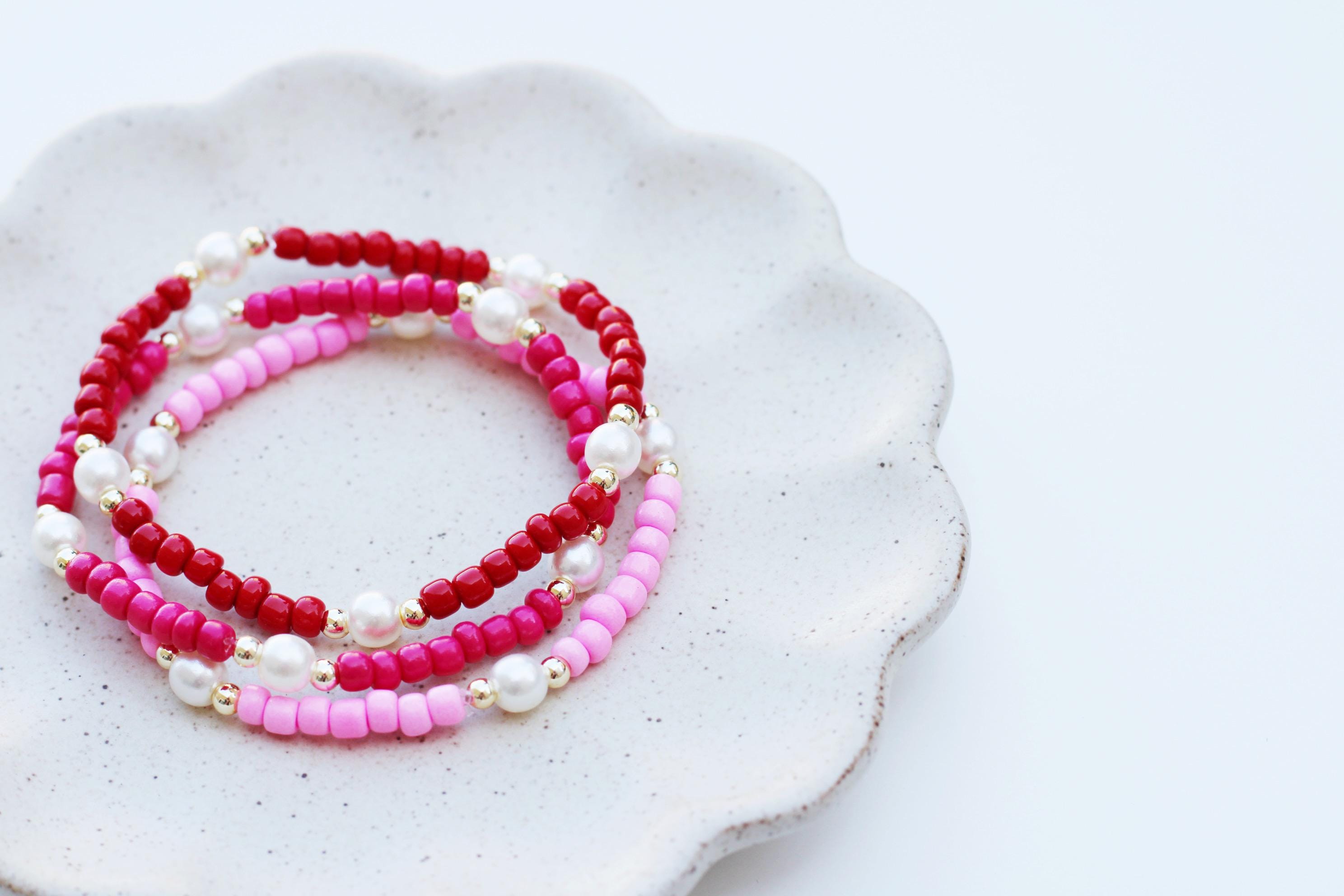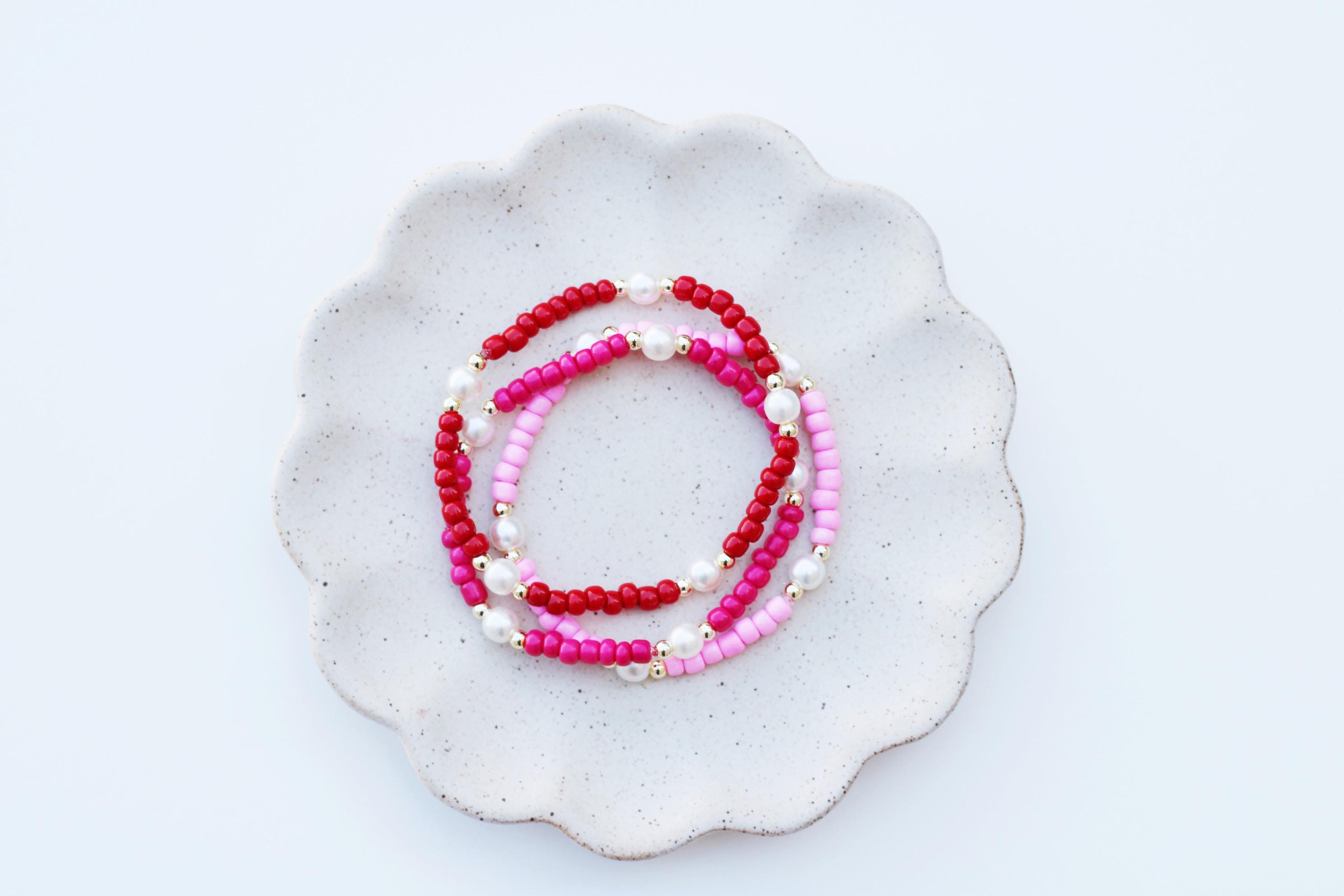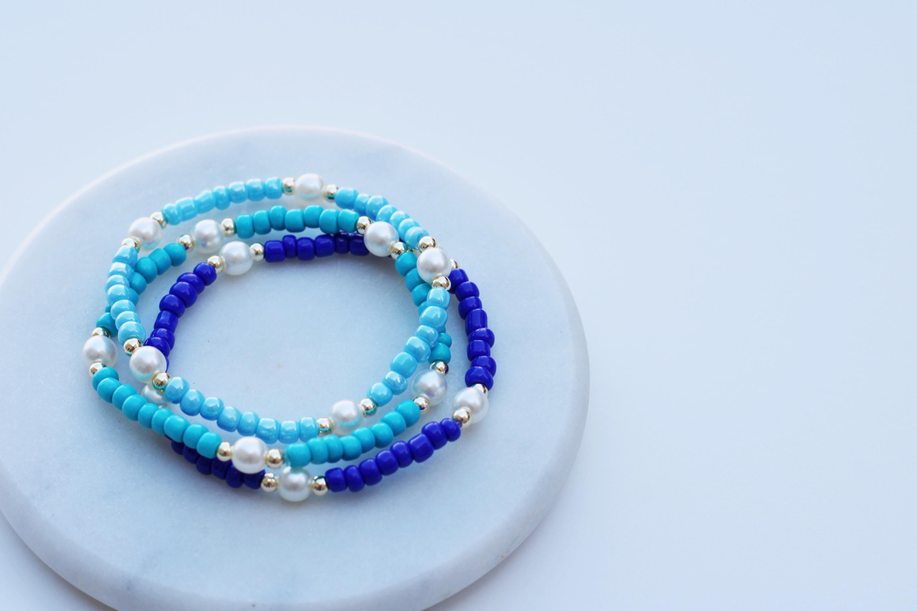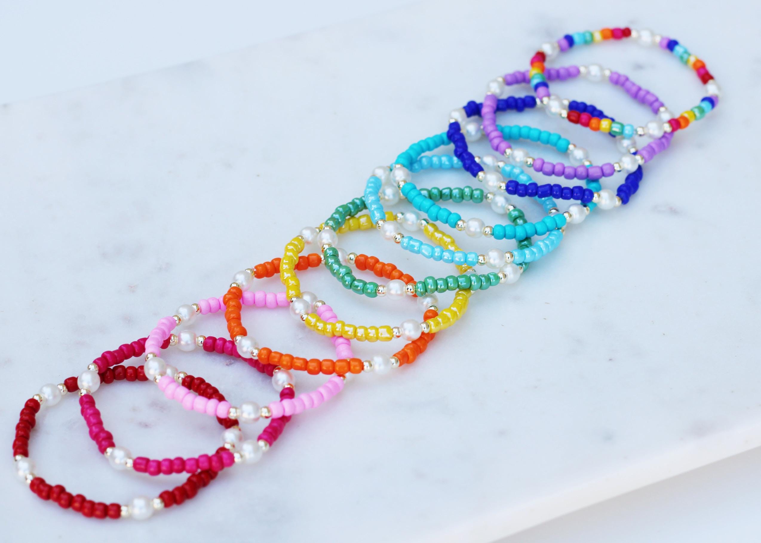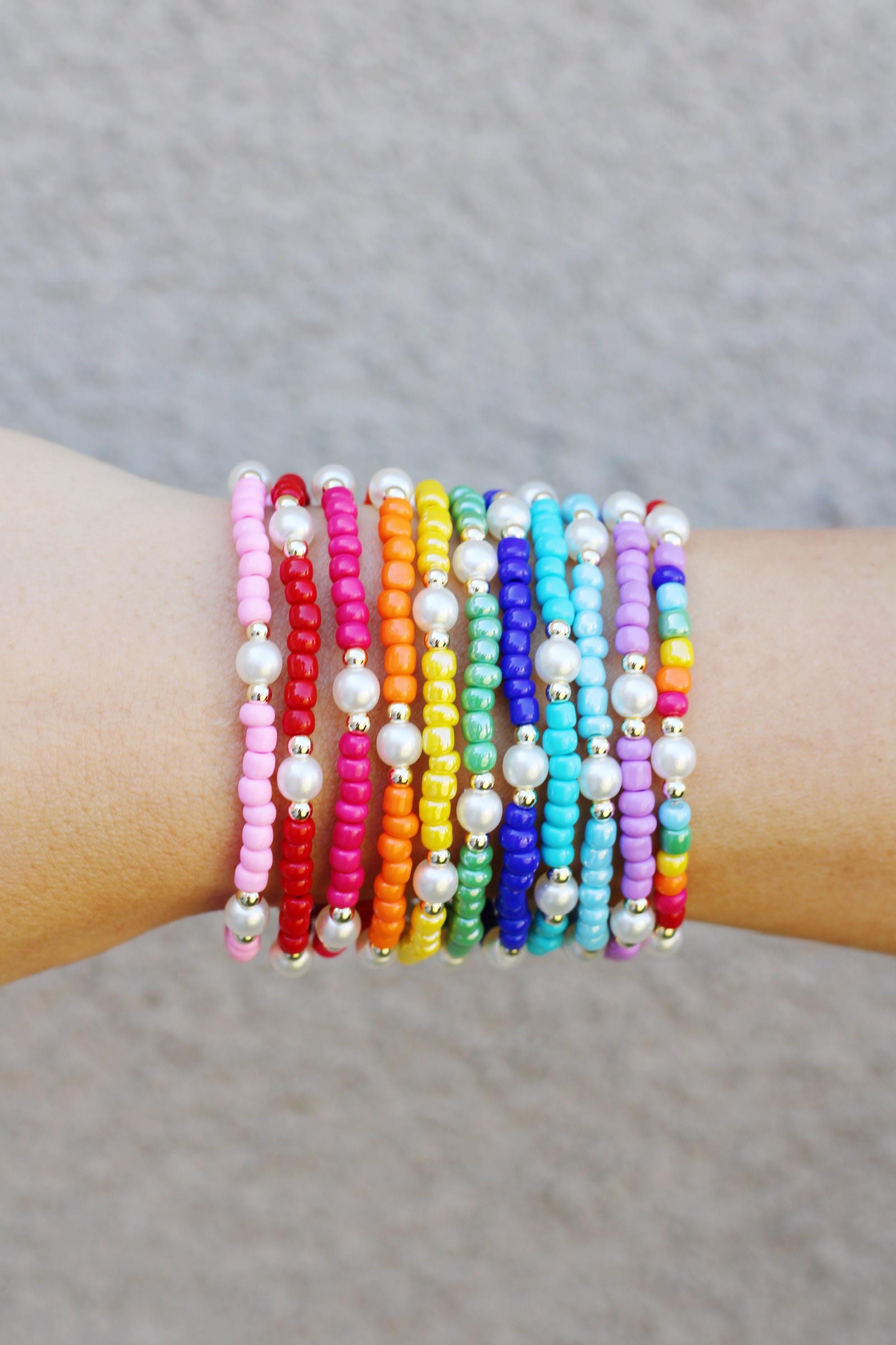 A pretty, lightweight stretch bracelet. Uniquely crafted with 3mm gold, silver or rose gold metal beads and accented with various colored seed beads and pearls (not freshwater pearls).
