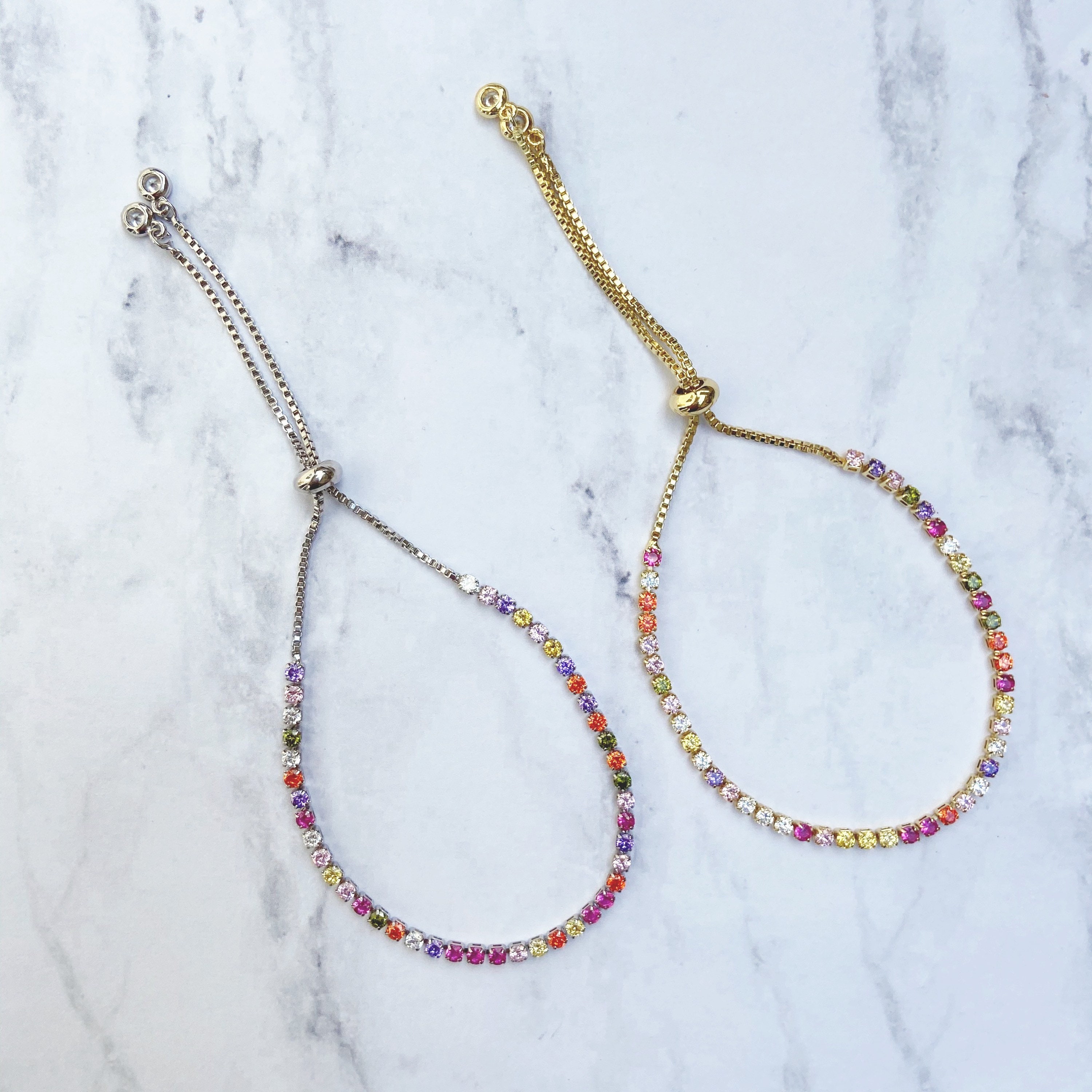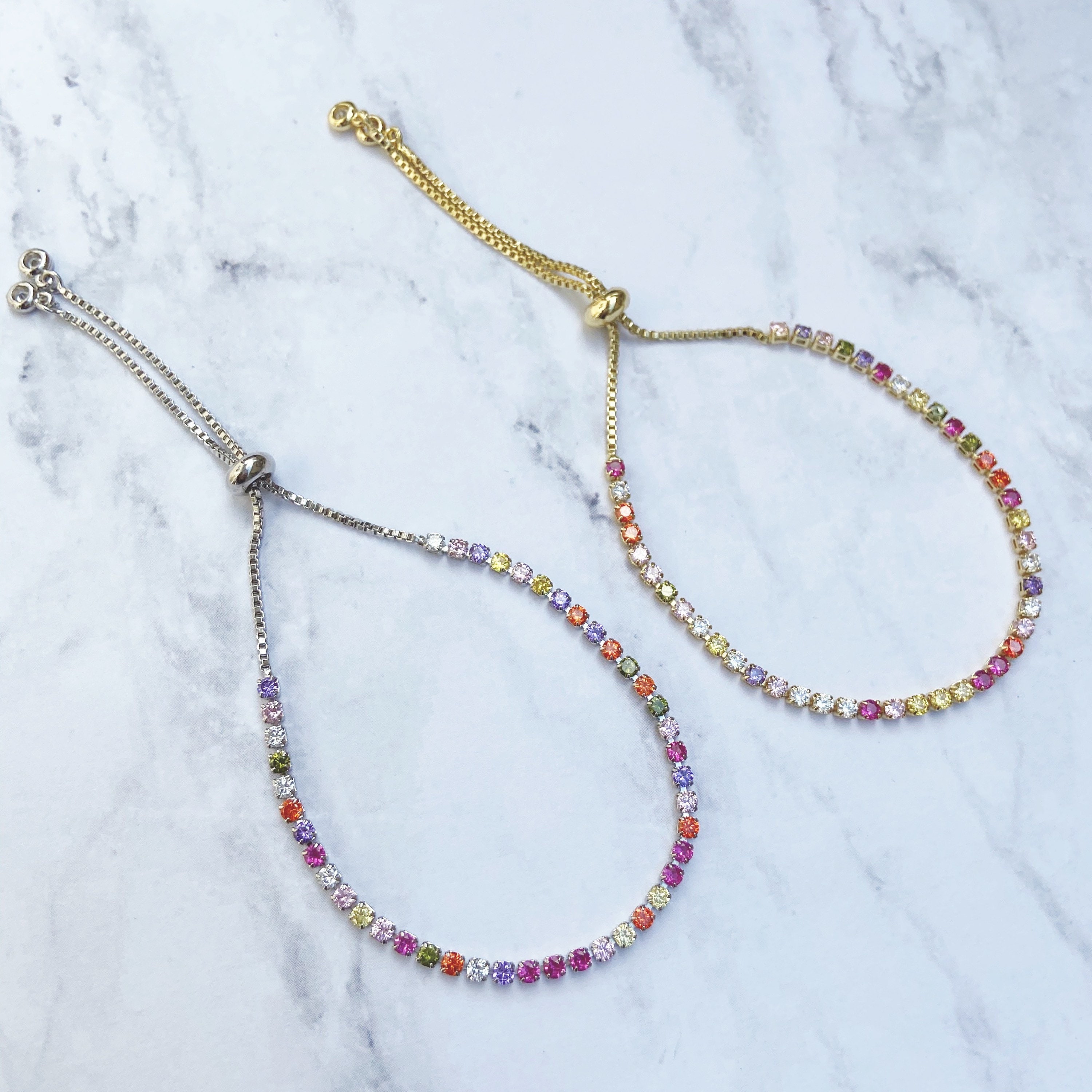 A cool, lightweight adjustable bracelet. Uniquely crafted with rainbow pavé cubic zirconia crystals in gold or silver.