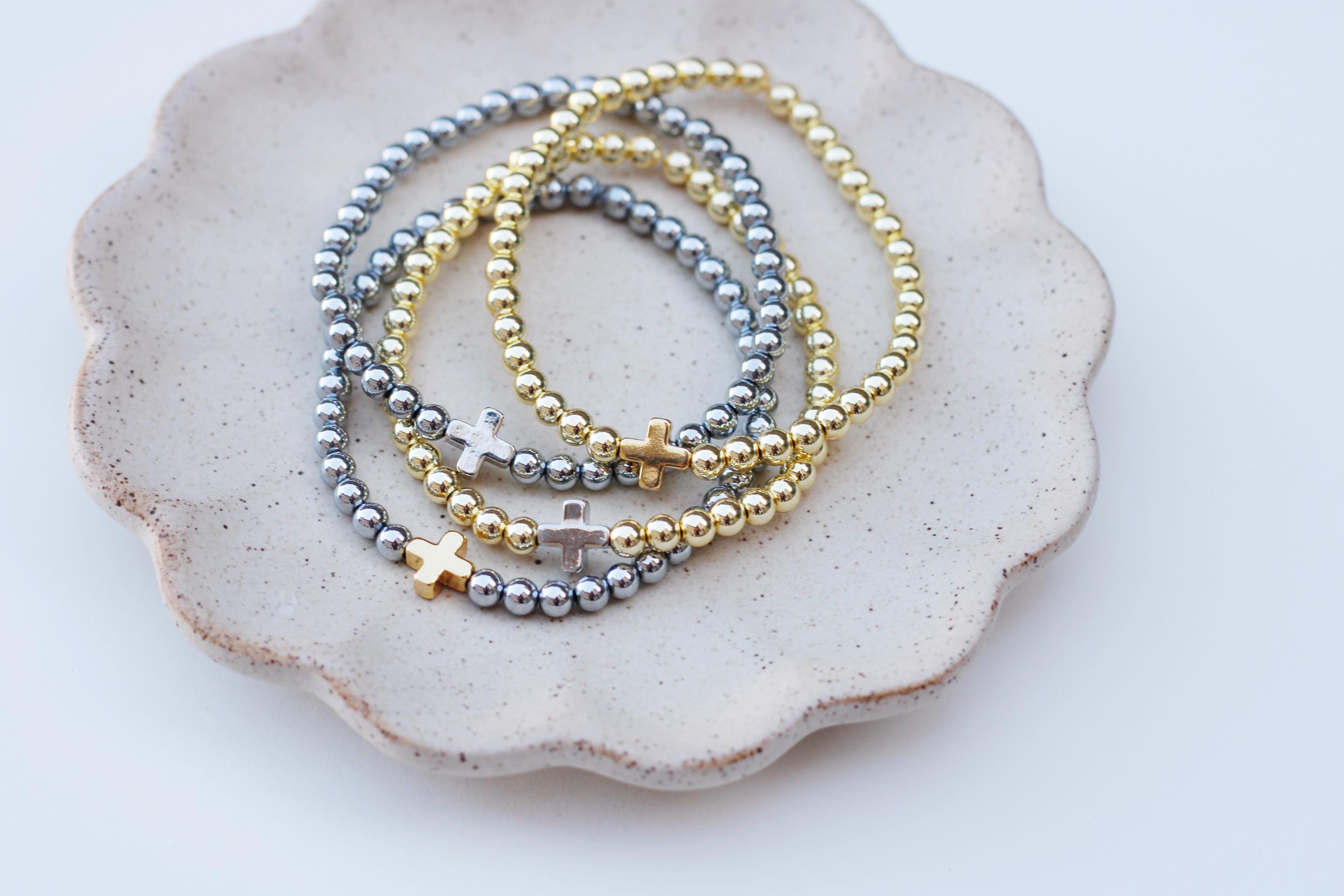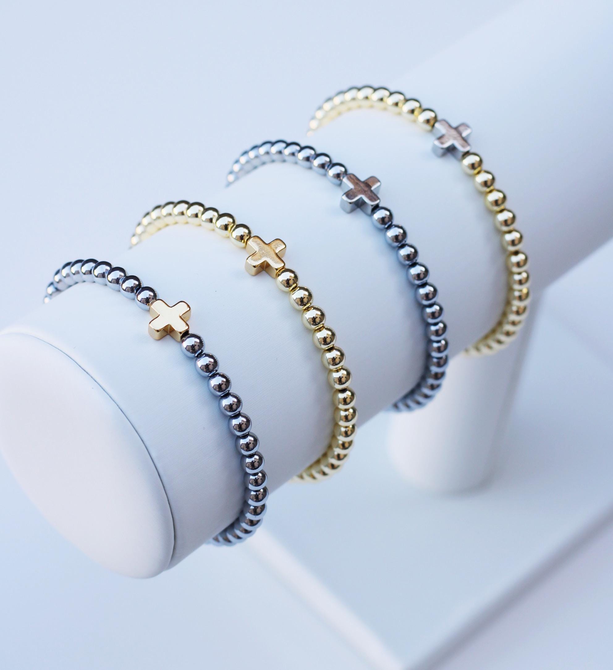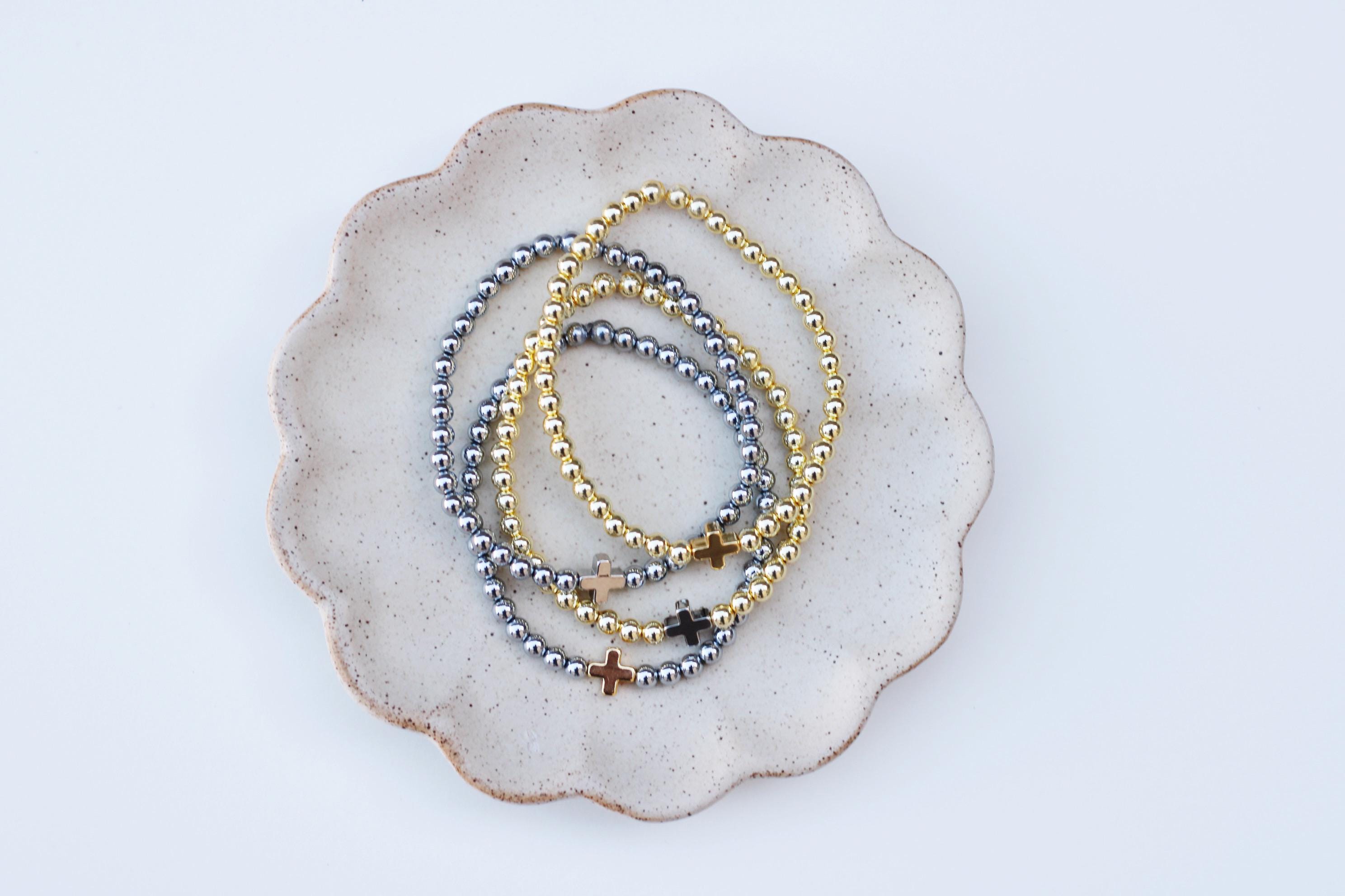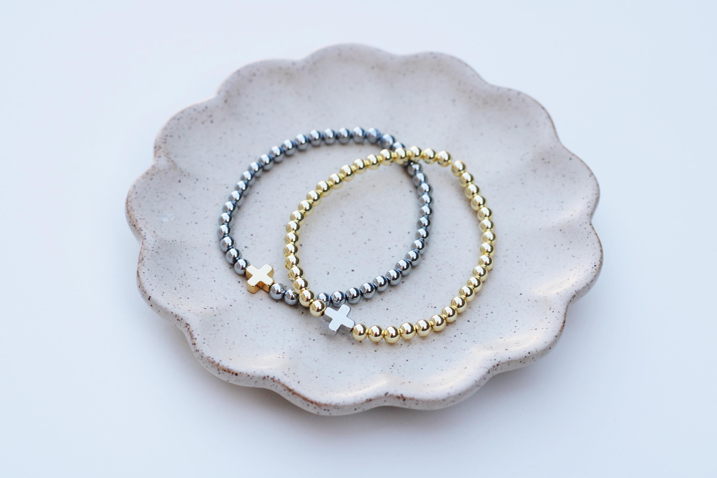 A cool, lightweight stretch bracelet. Uniquely crafted with 4mm 18k gold plated shiny gold hematite or silver hematite beads.