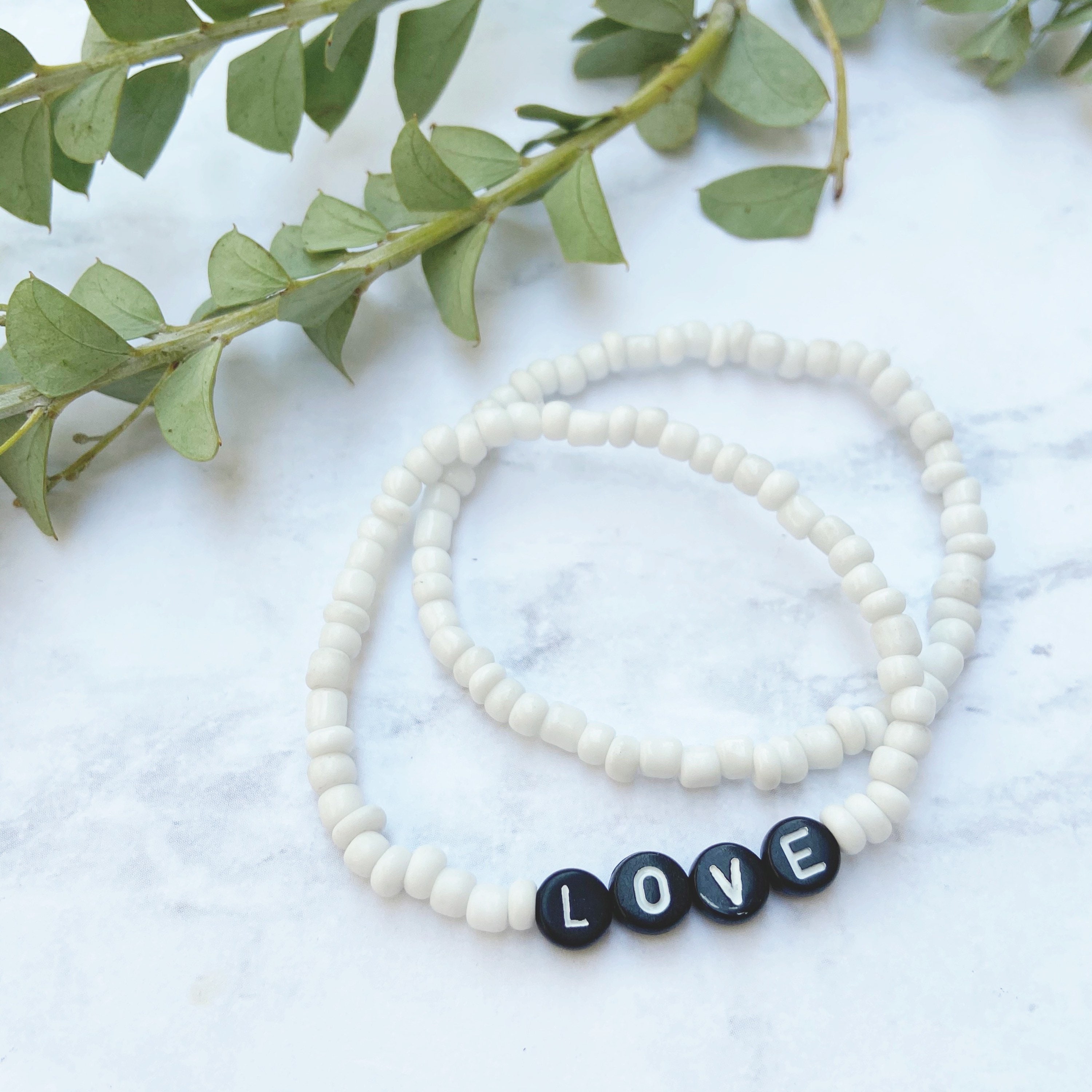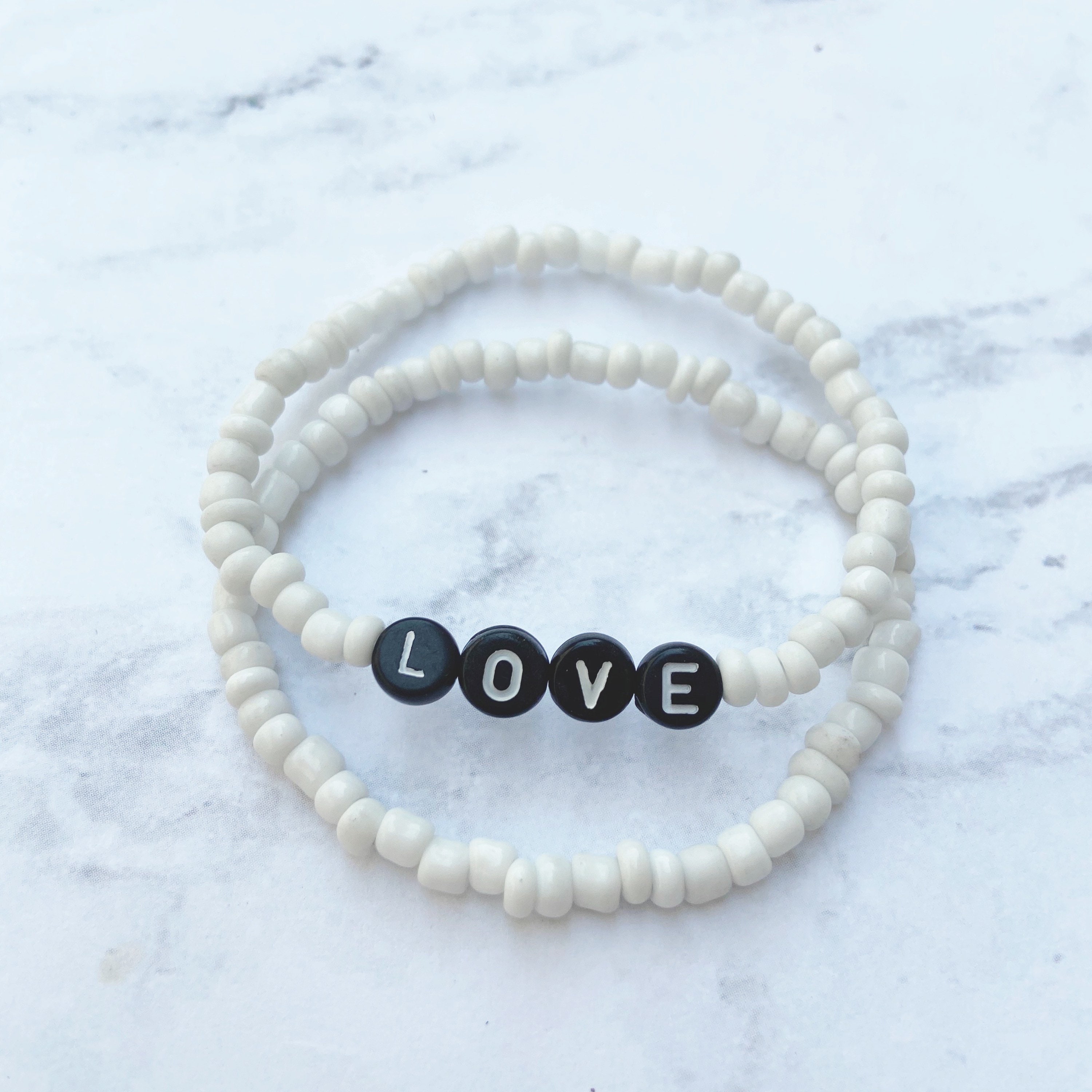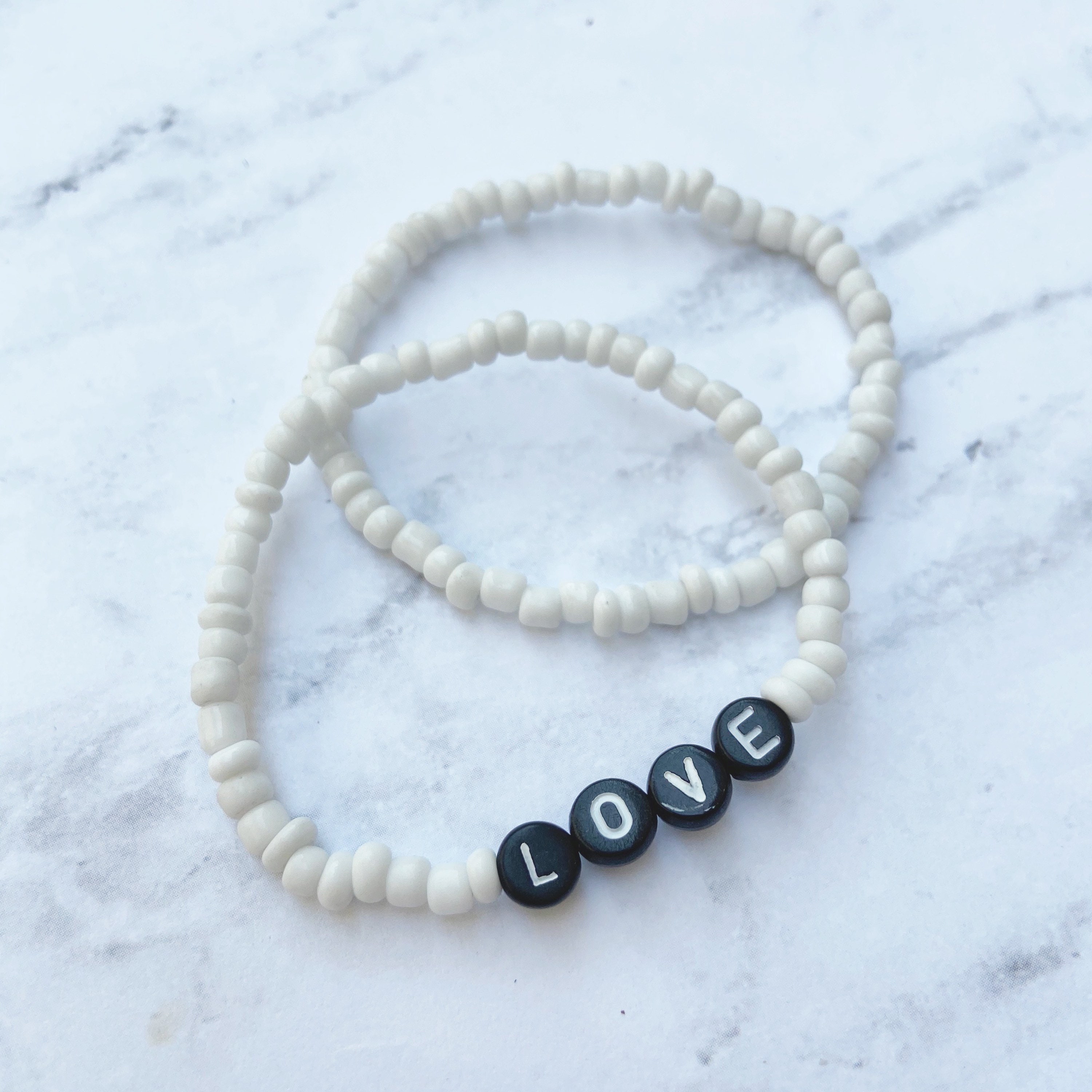 A cool, lightweight stretch bracelet. Uniquely crafted with white seed beads and accented with black or white letter beads.