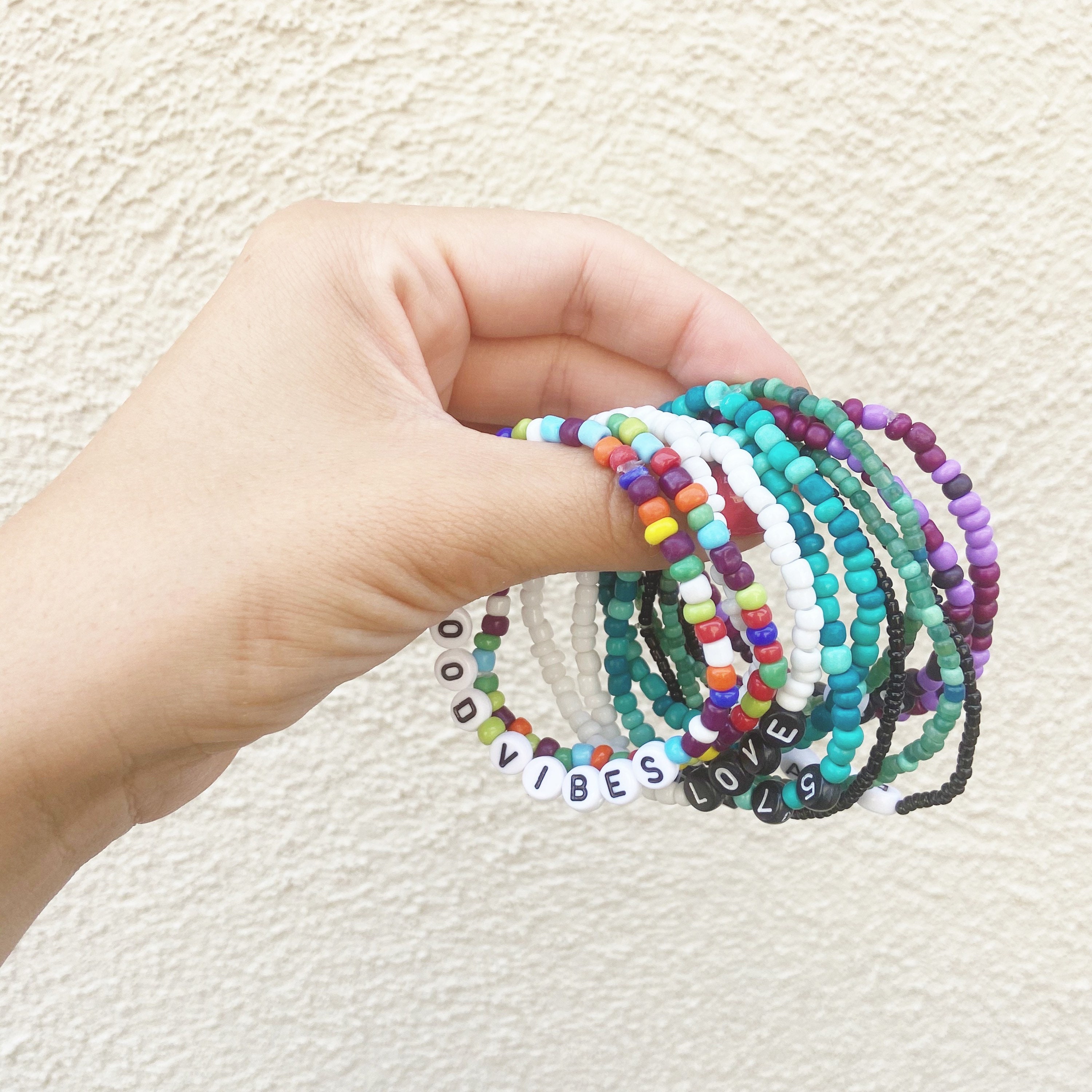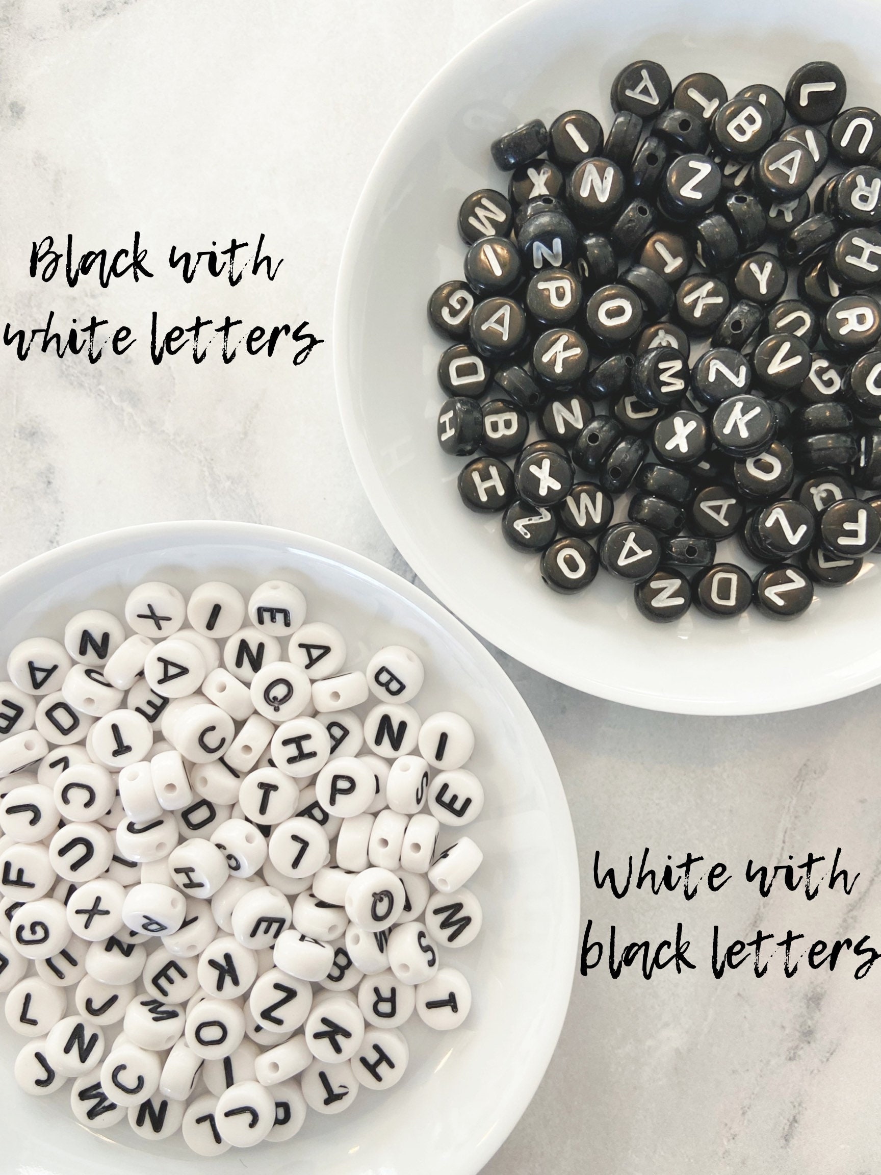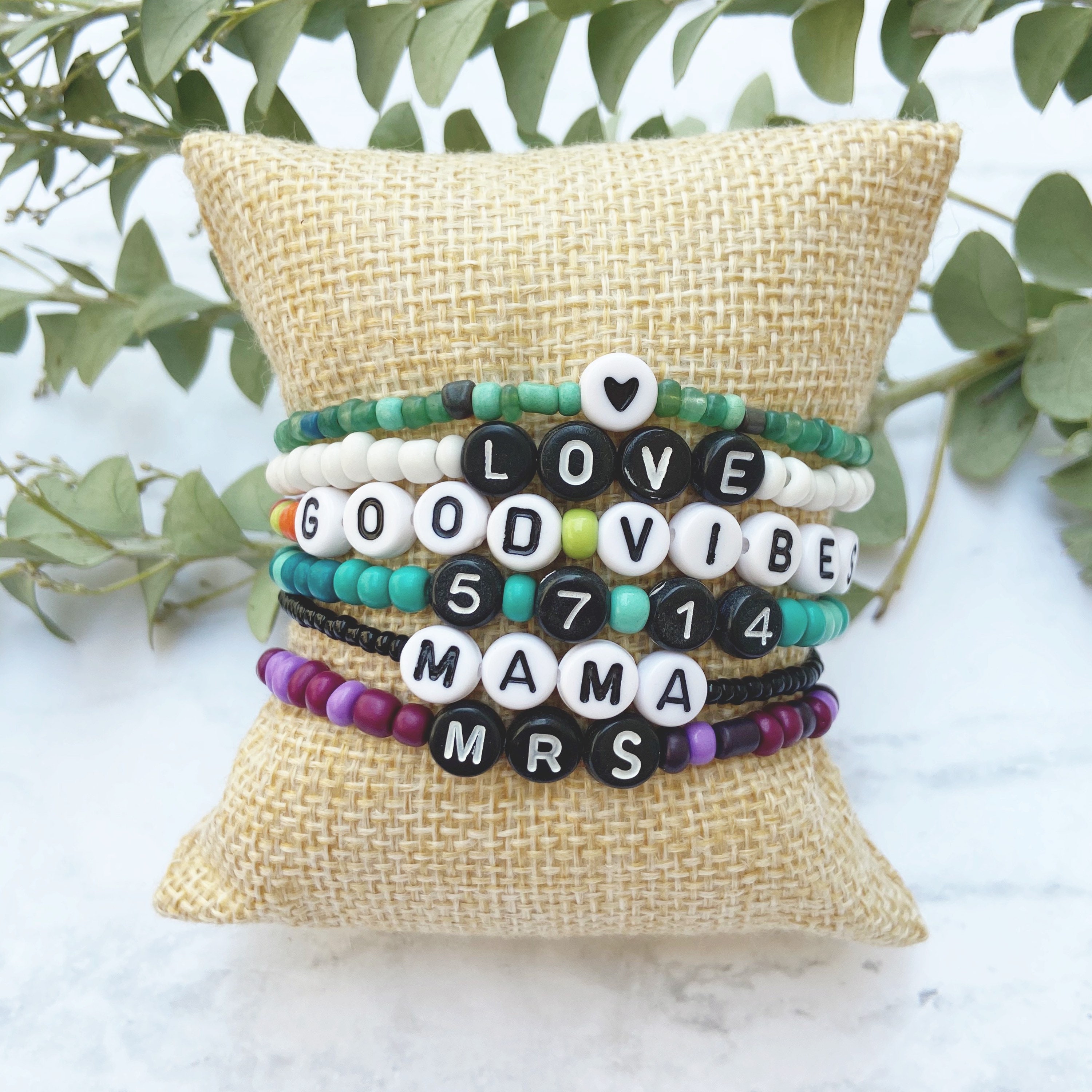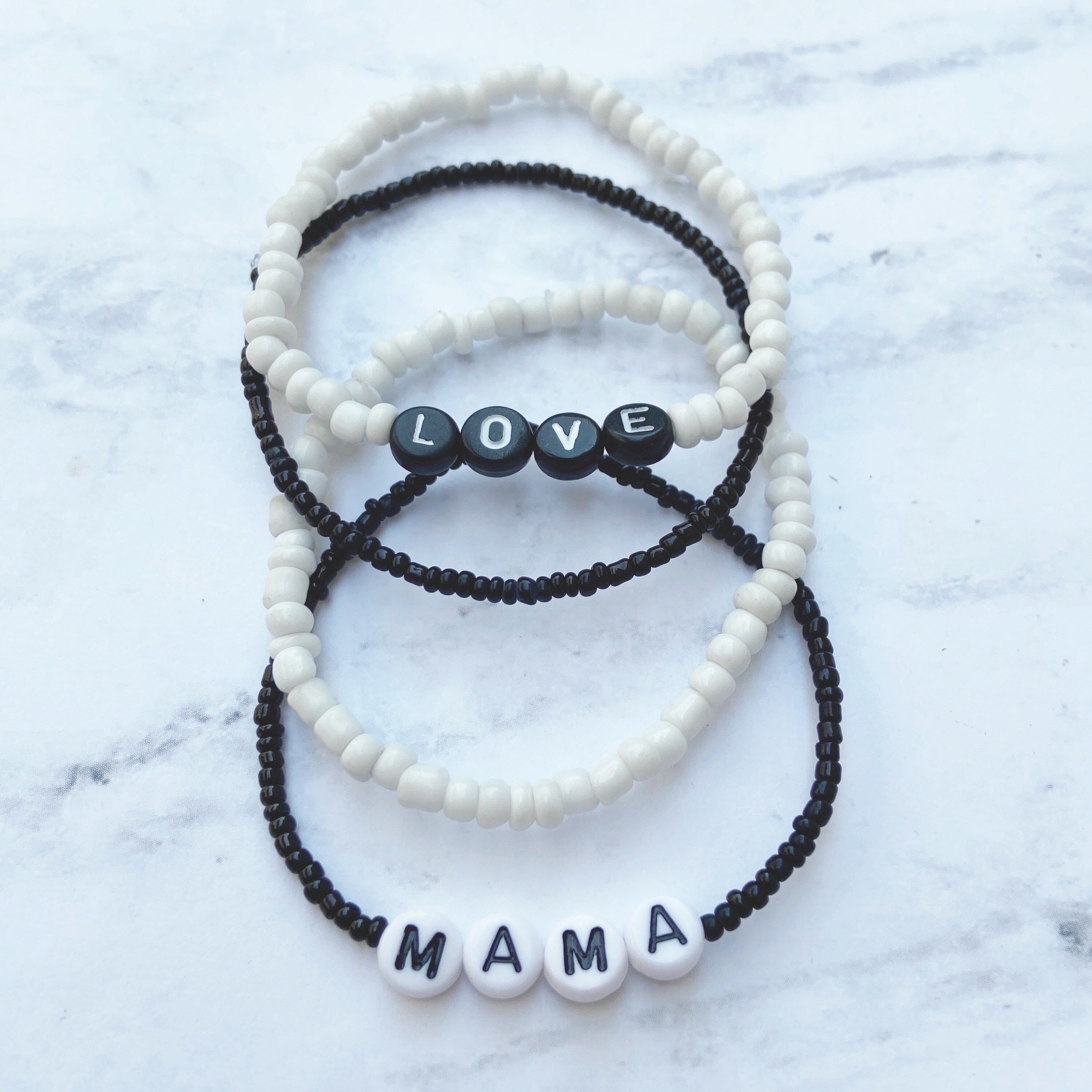 A cool, lightweight stretch bracelet. Uniquely crafted with white seed beads and accented with black or white letter beads.