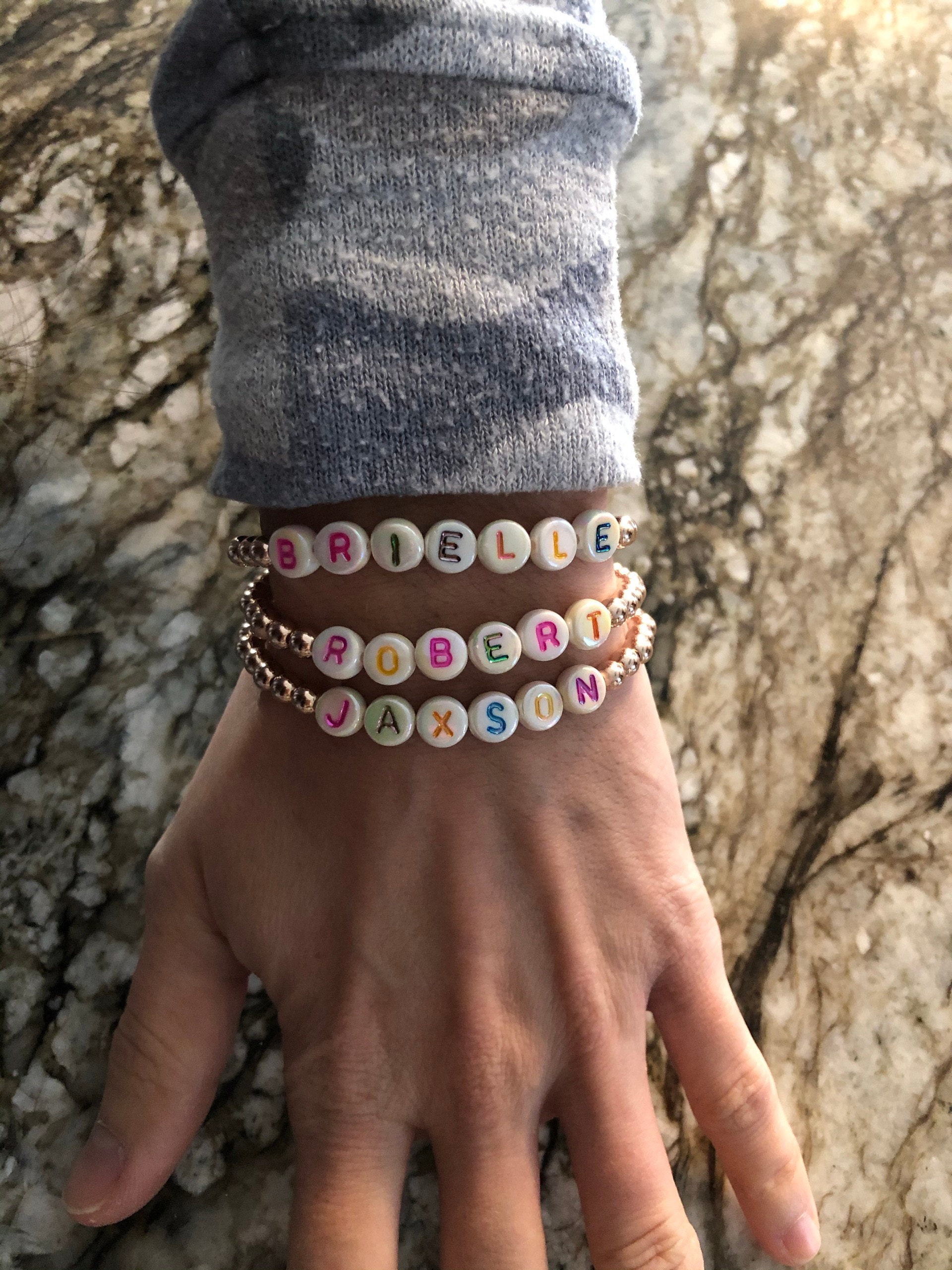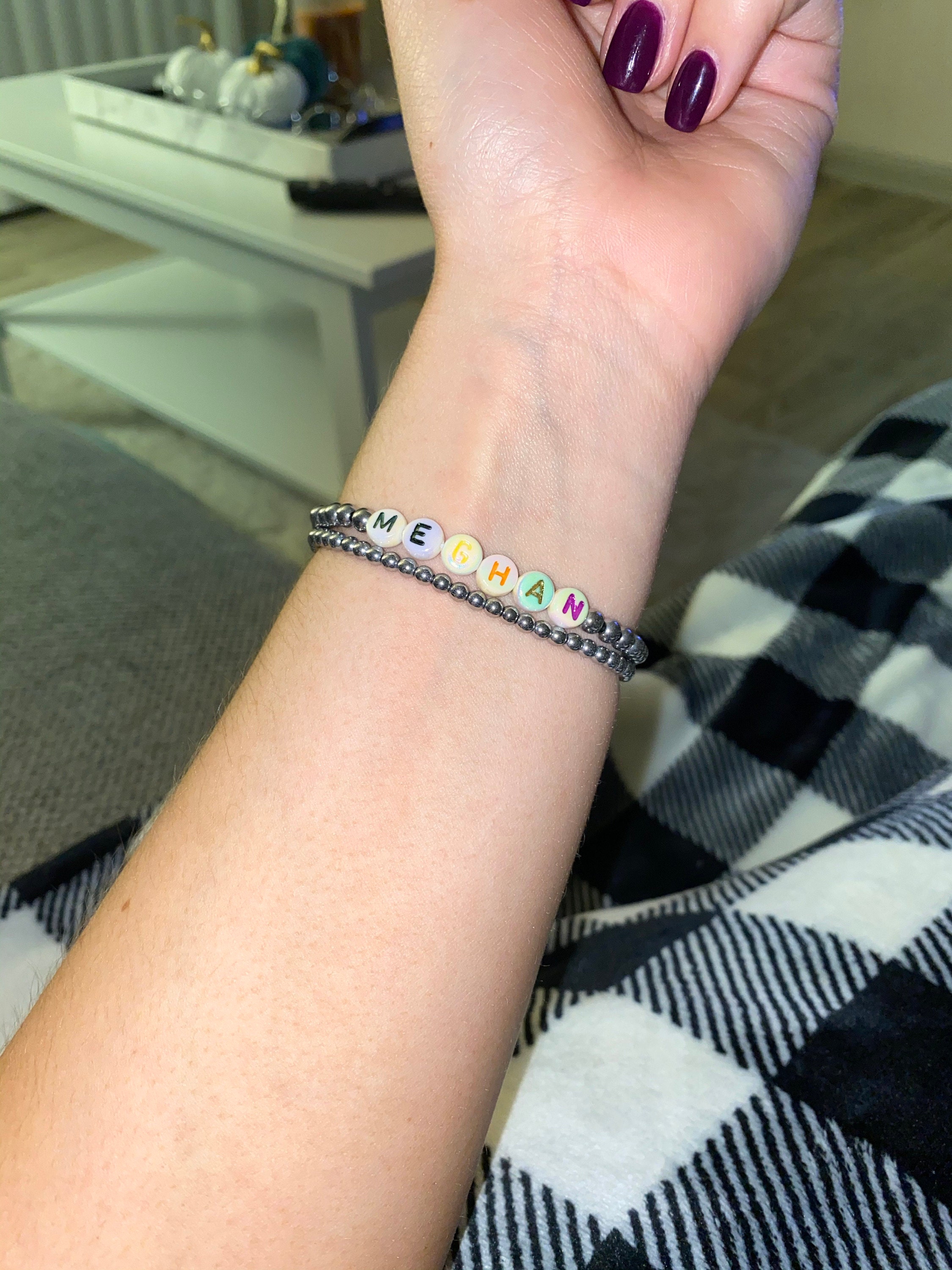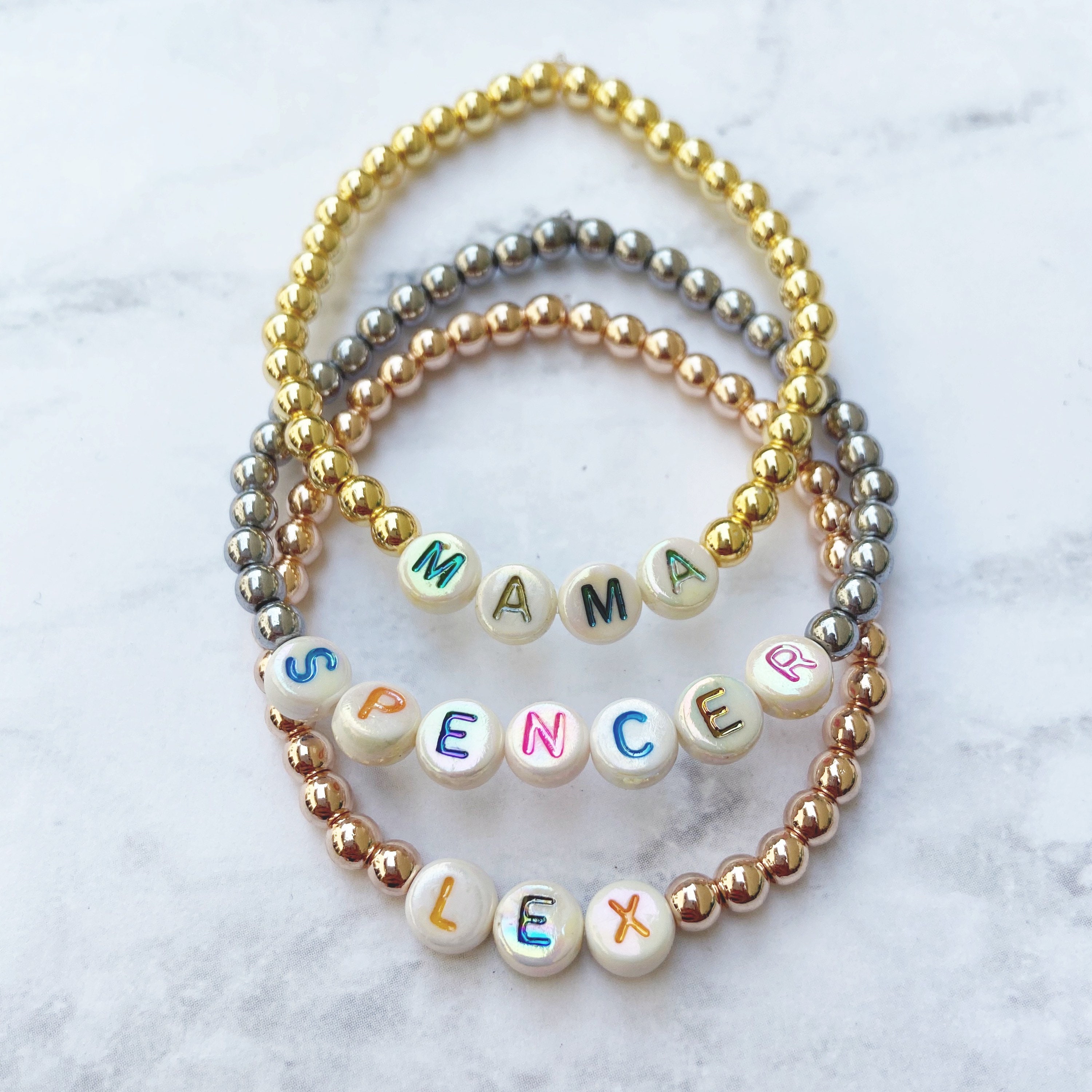 A cool, lightweight stretch bracelet. Uniquely crafted with 4mm 18k gold tone gold hematite beads, 18k white gold tone silver hematite beads & 18k rose gold tone hematite beads and accented with colorful letter beads.